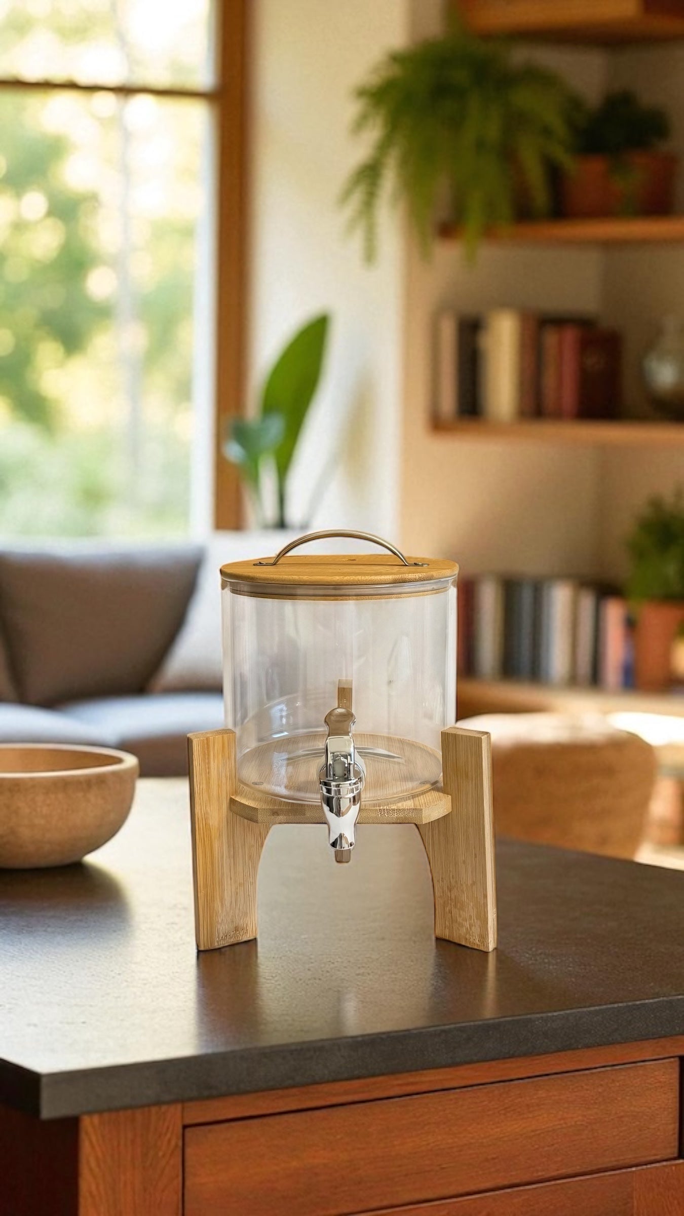 Eleganter Getränkespender aus Glas mit praktischem Edelstahlhahn und edlem Bambusdeckel – perfekt für Küche, Gartenpartys oder als stilvolle Erfrischungsstation.